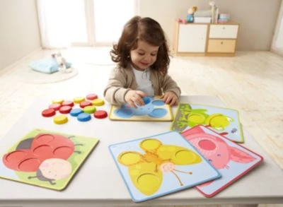 Auf fünf Tafeln sind verschiedene Tiere abgebildet. Diese haben Aussetzungen, die mit den Scheiben zu befüllen sind. Welche Farben haben die Mäuseohren oder die Flügel des Marienkäfers? Ihr Kind trainiert ganz spielerisch das Erkennen und Zuordnen von Farben. Dabei wird auch die Feinmotorik gefördert.