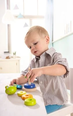 Wie groß ist der farbenfrohe Frosch? Das können Kinder herausfinden, indem sie Stück für Stück die einzelnen Holzteile aufeinanderstecken.