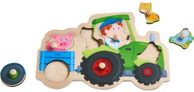 Was fehlt denn noch? Das fragt sich Bauer Ben bei dem HABA Greifpuzzle Lustige Traktorfahrt. Wer hilft ihm, die Räder an die richtige Stelle und das Schweinchen in den Anhänger zu setzen? Das Holzpuzzle nimmt Kinder ab 1 Jahr mit in die spannende Welt des Puzzelns. Dank der großen Griffe können kleine Hände die 6 Puzzleteile aus Holz bequem greifen und in die richtige Aussparung setzen. So trainieren junge Puzzler ihre Feinmotorik. Beim Zuordnen der Baby-Puzzle-Teile lernen die Kleinen die niedlichen Tiere zu benennen. Katze und Huhn möchten auch mit! Und los geht die lustige Traktorfahrt! 295cm x 197cm x 23cm