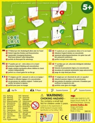 Mit dem Lernspiel LogiCase Starter Set 5+ von Haba lernen Kinder, Probleme eigenständig zu lösen. Zudem fördert das farbenfrohe Spiel ihr logisches Denken und ihre Konzentrationsfähigkeit. ab 5 Jahren 1 Spieler 40 Rätselkarten mit 77 Rätseln, 1 kleine Karte (Blende), 1 Rätselbox, 1 Holzstift mit Schnur und Kordelstopper Lernspiel In dem Lernspiel LogiCase Starter Set 5+ von Haba lösen Kinder spannende Aufgaben und kleine Herausforderungen. Nach dem Knobeln überprüfen die Kleinen ihre Antworten eigenständig auf Richtigkeit. Das schult die Problemlösungskompetenz, die Konzentration und das logische Denken. Das farbenfroh gestaltete und kompakte Set lässt sich dabei auch gut unterwegs nutzen. Mit verschiedenen Erweiterungspacks kann das Spiel um weitere Themenschwerpunkte und Schwierigkeitsgrade ergänzt werden.